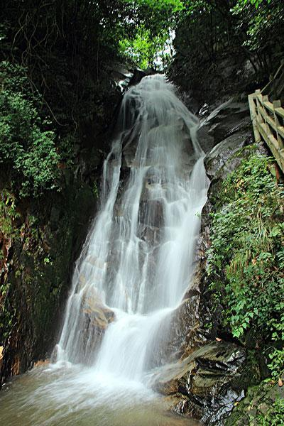金邊溪位于三角山森林公園中部,是一條自南向北延伸的天然大峽谷,全長12公里。峽谷兩岸奇峰陡峭千仞,怪石林立,鬼斧神工,萬丈深淵,遮天蔽日,溪流擊石,聲如雷鳴,玉珠飛濺,奔騰而瀉,似天而降。景色壯觀,氣勢磅礴。峭壁間古樹盤根虬枝,巍峨?yún)⑻?;溪流旁藤蘿遍地,花草含香,林木森森;瀑布?jí)嬄涮?,云蒸霧騰,氤氳彌漫,令人心動(dòng)神搖,嘆為觀止。身臨其境,似有“山塞疑無路,峰回別有天”之感。唐朝大詩人杜甫游金邊溪過青龍?zhí)稌r(shí)曾呤出了“高山猛虎嘯,深潭老龍呤”的兩句詩。