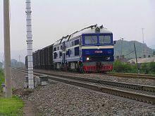 在濱綏鐵路重聯(lián)牽引貨物列車的東風(fēng)8型機(jī)車東風(fēng)8型機(jī)車采用交—直流電傳動(dòng),機(jī)車裝用一臺(tái)16V280ZJ型柴油機(jī)直接驅(qū)動(dòng)一臺(tái)TQFR-3000C型三相交流同步發(fā)電機(jī)發(fā)電,經(jīng)硅整流柜將交流電轉(zhuǎn)換為直流電,供給6臺(tái)并聯(lián)四極串勵(lì)的ZQDR-410型直流牽引電動(dòng)機(jī),通過(guò)牽引齒輪帶動(dòng)車輪。機(jī)車有六根車軸,走行部為兩臺(tái)三軸轉(zhuǎn)向架,軸式為Co-Co,牽引電機(jī)采用滑動(dòng)抱軸承式半懸掛方式。機(jī)車軸重23噸,總重138噸,構(gòu)造速度為100公里/小時(shí),標(biāo)稱功率3700馬力(2720千瓦);機(jī)車懸掛系統(tǒng)采用橡膠堆旁承,配置垂向、橫向油壓減振器;基礎(chǔ)制動(dòng)方式為獨(dú)立單元制動(dòng),并裝有電阻制動(dòng)裝置,適合在長(zhǎng)大坡道區(qū)段運(yùn)行。車體為框架式承載結(jié)構(gòu),兩端司機(jī)室。