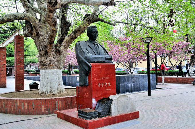 老舍雕塑位于園南端懸鈴木下。深紅色大理石鋪面,長(zhǎng)方形立座上塑有老舍胸像銅雕,面南。基座正面刻有老舍夫人題寫(xiě)的“老舍先生”,基座前底座西側(cè)有白色大理石石刻,刻有老舍著作《五月的青島》節(jié)錄。三部平放著作銅雕,上部封面刻有“櫻海集”書(shū)名。東側(cè)有銅質(zhì)斜立三部著作銅雕,書(shū)背分別刻有“蛤藻集”“RICKSAW BOY”和“駱駝祥子”。為公園的標(biāo)志性建筑。