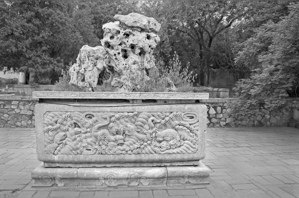 故宮主殿的臺(tái)基、階梯欄桿、走道、中庭、石橋,皆為各種石雕藝術(shù)形式有機(jī)組合。這些石雕是乾隆二十五年下令鑿去原有的明代紋飾后重新雕刻而成的。不過,從現(xiàn)有的石欄桿邊飾花紋,我們?nèi)钥煽闯雒髑骞蕦m石雕還是承襲了宋元以來的裝飾紋樣和技法。綜觀明清的皇宮園林,其建筑石刻運(yùn)用的廣泛,可說是到了無以復(fù)加的程度。它們雄辯地反映了一個(gè)事實(shí),那就是世界上最優(yōu)秀最偉大的建筑都離不開石雕裝飾構(gòu)件。在清代的皇家園林中,圓明園是被稱為“萬園之園”的偉大園林,令人痛心的是它于1860年被焚毀于八國(guó)侵略聯(lián)軍之手。如今我們從園中廢墟殘存的石雕建筑遺跡,仍可窺視到這座絕冠古今的園林建筑藝術(shù)的一些風(fēng)貌。