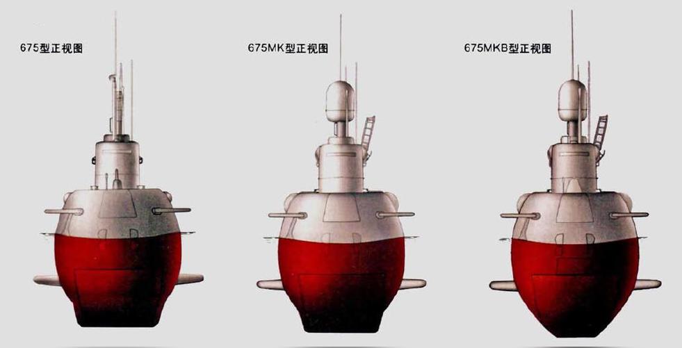 675型巡航導(dǎo)彈核潛艇675MK型在北德文斯克造船廠改裝的2艘分別是1977年11月至1982年3月改裝的K- 104和1978年12月至1982年3月改裝的K-128;而在共青城造船廠改裝的7艘分別是,K-175,1974年2月至1978年3月在中修時改裝;K-184,1975年10月至1978年6月中修時改裝;K-189,1976年12月至1982年7月中修時改裝;K-57,1977年6月至1978年1月中修時改裝;K-56,1979年8月至1986年11月中修時改裝;K-204,1972年10月至1977年12月中修時改裝;K-23,1979年3月至1984年12月中修時改裝。675型巡航導(dǎo)彈核潛艇675MKB型在北德文斯克造船廠改裝的3艘分別是,K-1,在1981年2月至1985年12月在中修時改裝;K-22,1985年12月至1987年12月中修時改裝;K-35,1986年8月至1990年9月中修時進(jìn)行了改裝。在共青城造船廠改裝的為1982年11月至1988年9月中修時改裝的K-34。