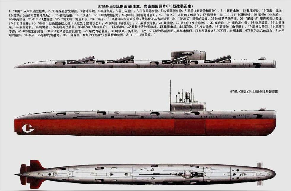 水上排水量5375噸,水下排水量6819噸,主尺度、動力裝置、下潛深度等也均同675原型一樣,但水下航速22節(jié),比675型低了1節(jié)。也裝有“燕子-Б”衛(wèi)星目標(biāo)指示系統(tǒng),導(dǎo)彈火控系統(tǒng)更新為“氬-KB”,也能和導(dǎo)彈起飛準(zhǔn)備系統(tǒng)一起,一次齊射發(fā)出全部8枚導(dǎo)彈。為使新型的МГК-100“刻赤”聲吶有更好的工作環(huán)境,將主聲吶的導(dǎo)流罩結(jié)構(gòu)和外形都作了更改。非耐壓艇體也將低磁鋼換成了高碳鋼,發(fā)射筒和上層建筑都裝有用舷外海水的外噴淋系統(tǒng)。K-1艇最初裝有直角形的氣體檔板,但由于不能保證在導(dǎo)彈起飛時可靠地排出氣體,使得艇體外殼板受到部分損壞。因此后來在其余的艇上,氣體檔板改用防火鋼制成,厚度也增大。675MKB型除裝備有新型的P-1000巡航導(dǎo)彈外,還裝備有對空導(dǎo)彈“箭-3M”(北約稱SA-N-8艦空導(dǎo)彈,蘇聯(lián)代號9M36),在K-1艇上用于貯存該型導(dǎo)彈的彈藥箱在指揮室圍殼內(nèi),僅攜彈6枚。而在675MKB型的其它K-22、K-35和K-34艇,彈藥箱則在艇尾部上層建筑甲板的下面和指揮室圍殼內(nèi),因此都可攜帶18枚。