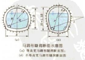 馬蹄形隧洞是指橫斷面為馬蹄形的隧洞。這種斷面的周邊由4個(gè)圓弧組成:洞頂為半圓拱,兩側(cè)接曲率半徑較大的邊拱,洞底為向上仰的底拱,邊拱與底拱的連接處用圓弧修圓。