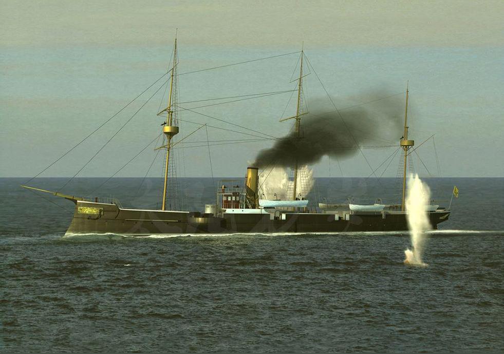 150毫米‘克虜伯’主炮3門,最大射程11000米。其中2門分別位于軍艦中部靠前兩側的耳臺中,炮手有舷墻作有限防護,另外1門位于艦尾,有25.4毫米的防盾防護,射速2分鐘1發(fā),共備彈300發(fā);120毫米阿姆斯特朗炮4門,備彈數(shù)目不詳,有舷墻防護;37毫米5管‘哈奇開斯’速射炮4門,位于羅經艦橋兩側和機艙房兩側,射速1分鐘60發(fā),炮手無防護。比第五號艦“橫?!备鼮橄冗M的是:該船配備了2具魚雷發(fā)射管,可以沖擊敵艦。