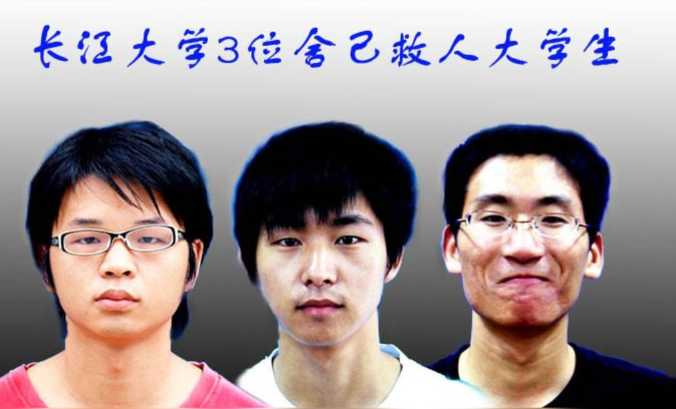 2009年10月24日,長江大學(xué)文理學(xué)院的40多名同學(xué)結(jié)伴出游,同學(xué)們?cè)陂L江邊游玩時(shí),突然發(fā)現(xiàn)兩個(gè)小男孩在江中掙扎。危急時(shí)刻,站在沙灘上的10多名同學(xué)手拉手組成人梯下水幫忙,兩名少年獲救了。而陳及時(shí)、何東旭、方招3人卻因救人后體力不支消失在湍急的江水中,獻(xiàn)出了年僅19歲的寶貴生命。
