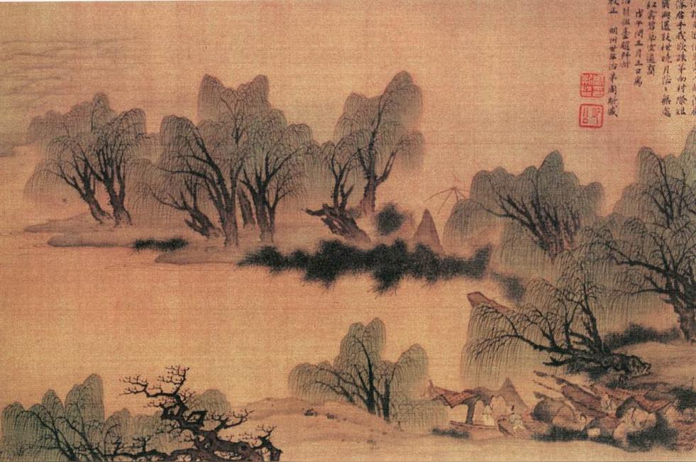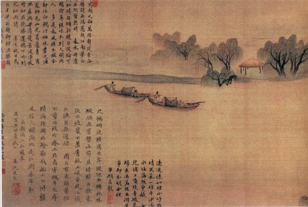 《柳溪漁樂圖》描繪的是江南水村,起首作河渚深處兩岸陂陀夾行,柳樹叢中房舍掩映。隨著柳樹展開,坡堤逶迤入水,漁舟系泊岸邊。水面逐漸開闊,柳堤村舍漸遠,直至水天相接,無邊無際。