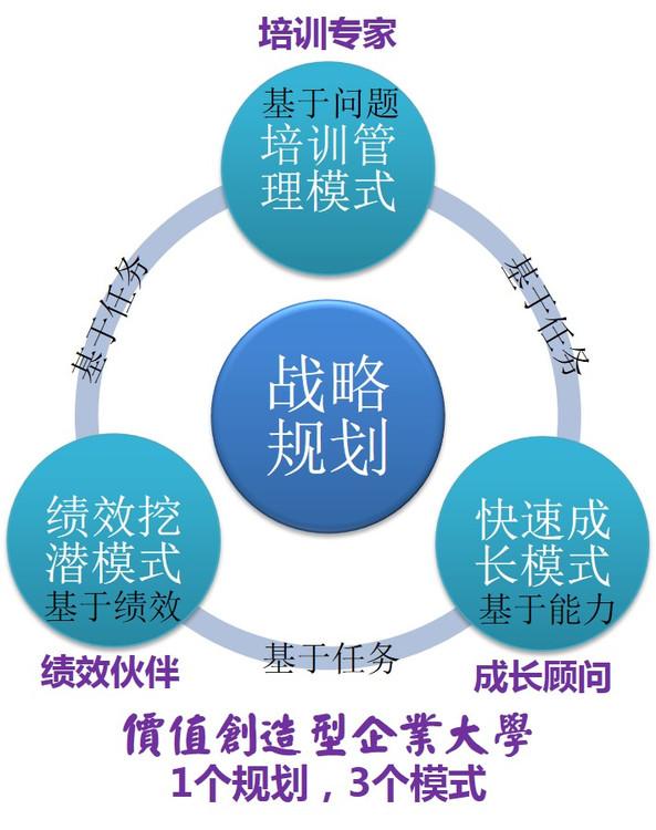 現(xiàn)代企業(yè)大學理論有別于傳統(tǒng)的規(guī)范化思維,強調效果導向,通過系統(tǒng)化的思考,把握企業(yè)大學價值創(chuàng)造的關鍵環(huán)節(jié)有效配置資源,進而創(chuàng)造出最大價值。現(xiàn)代企業(yè)大學理論的代表為價值創(chuàng)造型企業(yè)大學理論體系,該理論以一個戰(zhàn)略、三大模式為核心,在明確方向、路徑、階段重點、衡量標準和關鍵控制點的基礎上,集中資源分階段系統(tǒng)打造三大模式,分別解決有限培訓資源價值最大化、人才輩出機制與規(guī)模領導力建設、績效快速提升這三大價值創(chuàng)造核心問題,最終實現(xiàn)企業(yè)績效和競爭力的快速、大步、持續(xù)提升。