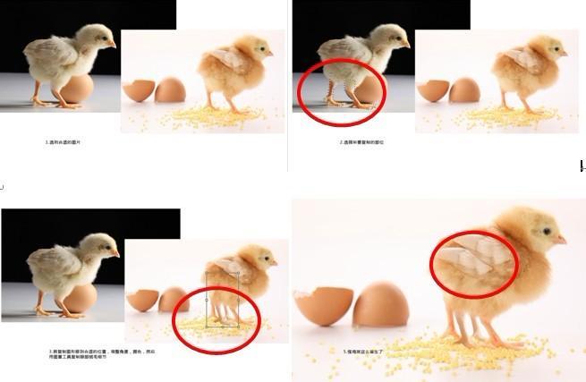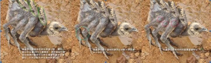 針對網(wǎng)絡(luò)上六翅雞的謠言,很多懂得PS的網(wǎng)友都指出這樣的PS技術(shù)很粗糙,很容易可以看出 另外兩對翅膀只是復(fù)制之后調(diào)整了角度再粘貼上去的,如圖中所示。