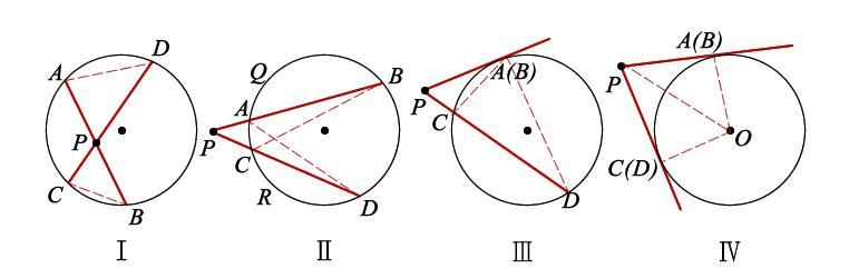圖Ⅰ:相交弦定理。如圖,AB、CD為圓O的兩條任意弦。相交于點(diǎn)P,連接AD、BC,由于∠B與∠D同為弧AC所對(duì)的圓周角,因此由圓周角定理知: