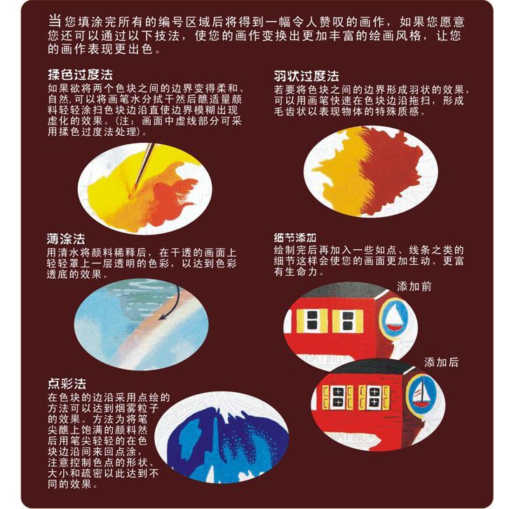 當(dāng)您填涂完所有編號(hào)區(qū)域后將得到一幅令人贊嘆的畫(huà)作,如果您愿意您還可以通過(guò)以下技法,使您的畫(huà)作變換出更加豐富的繪畫(huà)風(fēng)格,讓您的畫(huà)作表現(xiàn)更出色。