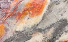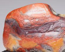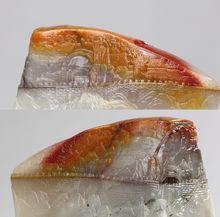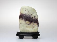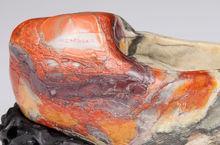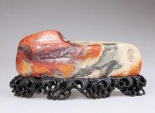 這是用一塊掘性高山石來做材質(zhì),該石頭頂部為紅色,下半部為暗灰色,其中間隔著一條乳白色的條帶,這恰好為作品刻畫“渭流漲膩,棄脂水也;煙斜霧橫,焚椒蘭也”的場(chǎng)景。