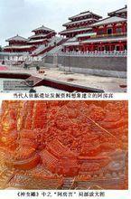 作品上方用夸張的手筆把“阿房池”雕成又大又深的一個(gè)沐浴池,即“阿房池”;其左上方為秦始皇天天登臺(tái)燒香祈禱天神的“上天臺(tái)”,不過,臺(tái)未完工秦始皇便在出巡的路上死去了。