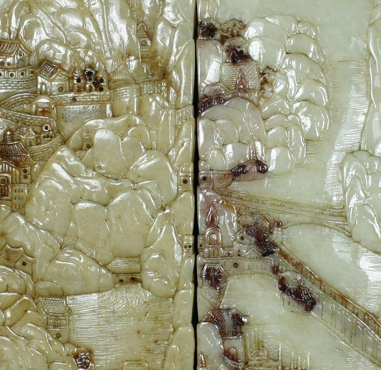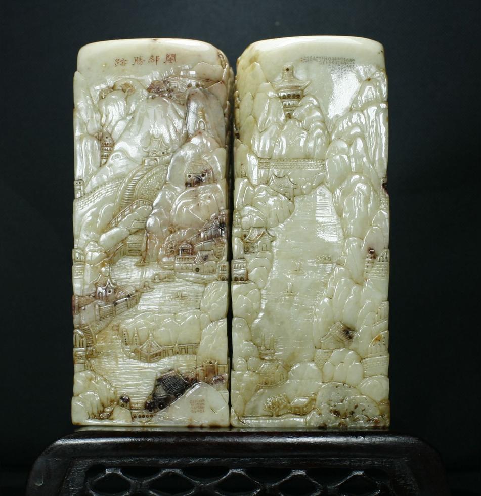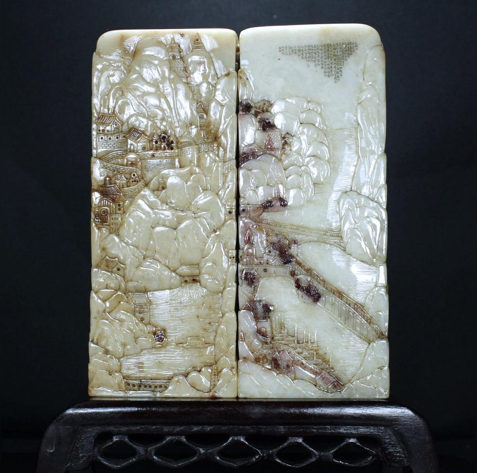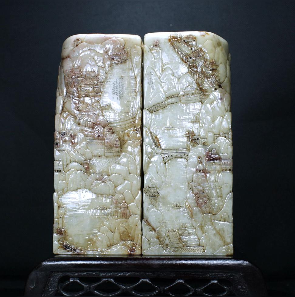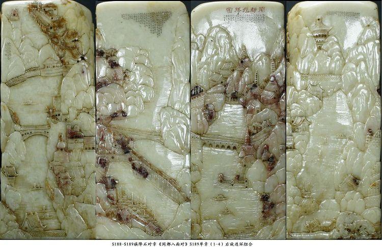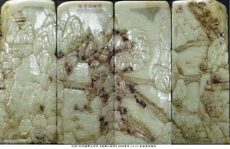 第一次嘗試相當成功,每個方章四個面可以連成一幅四屏圖,而將二個方章并對在一起,又可形成一幅六屏圖,這樣一來,對應翻轉(zhuǎn)后則共又有了四幅六屏圖。構(gòu)思成熟,即動手以微畫雕方式來雕刻了,當然畫面布局也只能以散點透視構(gòu)圖法來施展。為使方章對應畫面能連成一體,可謂用心良苦。前后用了一半多時間作品總算初創(chuàng)完成了。