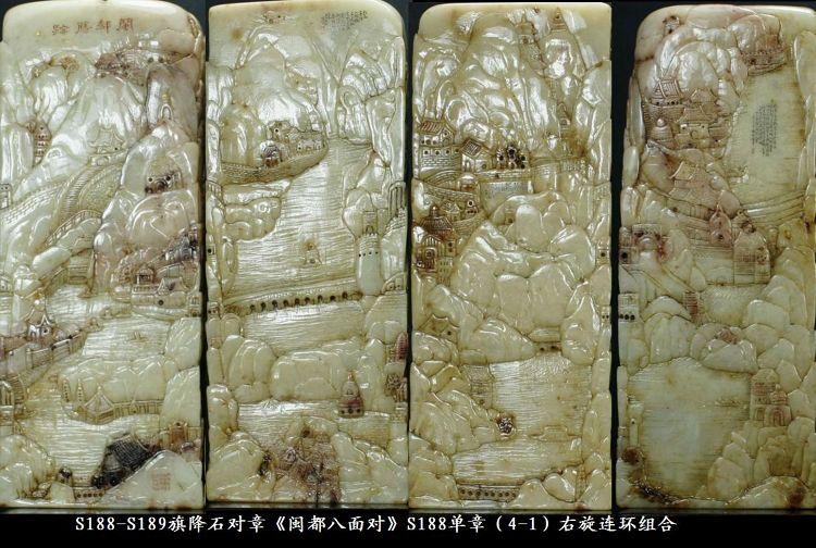 然而創(chuàng)作《閩都八面對》并非一帆風順的,盡管此時作品有了方章各自的四個面用來表述其中的某個故事情節(jié),一對則有八幅獨立單屏圖,每個方章四面連成一幅四屏圖,一對則有二幅四屏圖,加之二個方章并對所形成四幅六屏圖,按理可把包括《閩都別記》在內(nèi)的所搜集到的福州民情民俗表述得差不多了吧?!可創(chuàng)作者依然余意猶酣,感覺有些故事情節(jié)應連貫在一起,可卻在這作品還未能給出表現(xiàn)。于是試圖將對章左右位置調(diào)換后再來翻轉(zhuǎn)并對,此時某些故事情節(jié)可以連接一起了,但方章間畫面又沒法連成一片,加之石頭自身的一些紋理使它們銜接難上加難…
