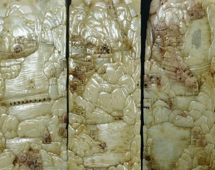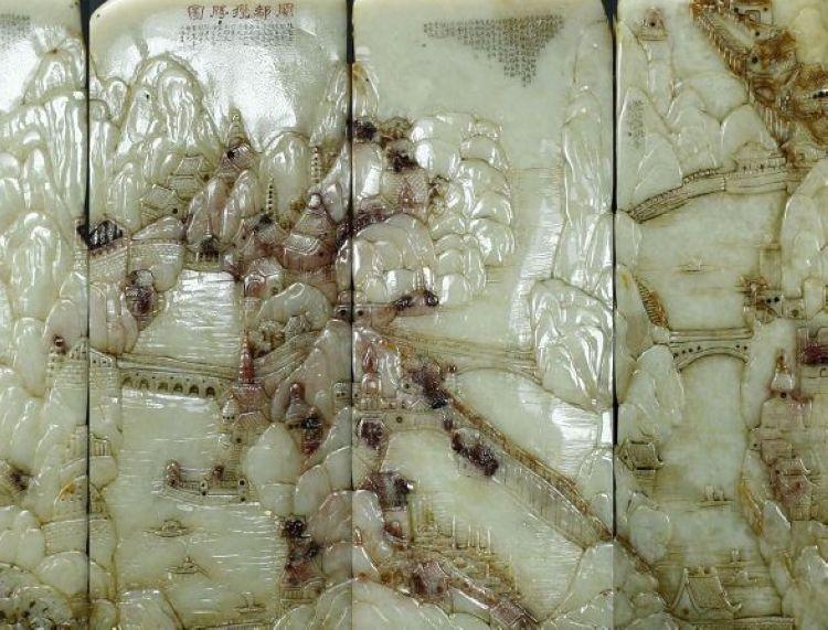 1989年六月,創(chuàng)作者得到一對較大的旗降石素對章,每個方章有四面,而一對則有八個面,如何利用這八面材質(zhì)將一些真實可靠的民情民俗刻畫出來呢?創(chuàng)作者又依據(jù)故事情節(jié)和石面色澤再次草繪了不計其數(shù)的畫面,并將這些畫面一二對應,希冀達到故事情節(jié)既相互連貫又各自獨立,形成幾幅長卷……