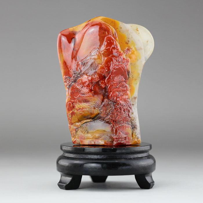 這一面上部刻意留下大塊空白,著意磨光后讓其留下杜陵石特有的金黃色,這五彩繽紛的彩霞色彩紅艷,形狀多變,好像一幅抽象畫(huà),由于散射的緣故,把“仙家勝景”點(diǎn)綴得格外美麗動(dòng)人。作品用?這種蒙朧的美把《仙家勝景正斜曛》引入更深的境界…