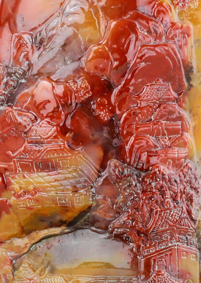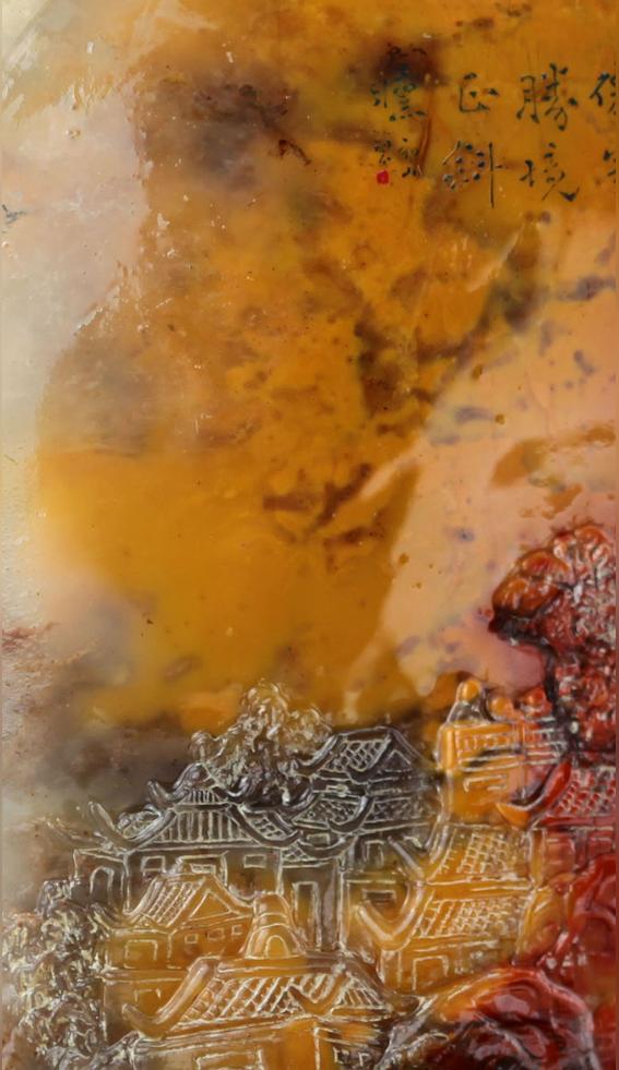 藝術(shù)作品《仙家勝景正斜曛》采用焦點(diǎn)透視法,站在湖邊向山上仰視,把斜曛下仙家勝景刻畫(huà)得淋漓盡致;而在作品另一面,除底部精雕了幾座仙家宮觀寺廟外,卻留下大塊磨光的空白,讓杜陵石固有的金黃色來(lái)表現(xiàn)五彩繽紛的彩霞,把個(gè)《仙家勝景正斜曛》引入到更深的境。