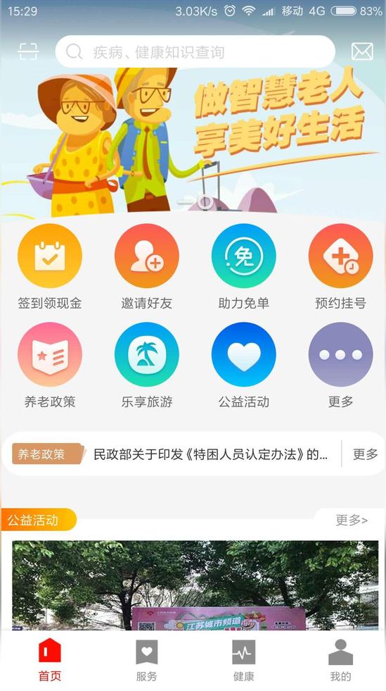 智慧老人APP包含預(yù)約掛號、疾病自查、找醫(yī)生、家政服務(wù)、養(yǎng)老政策、不定期舉辦公益活動(dòng)、開設(shè)老年大學(xué)課程,同時(shí)為老人提供智能適老家居、日間照料等服務(wù)。