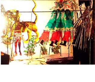 2、3折沒(méi)有固定格式,或前臺(tái)挑財(cái)神皮影角駕云上殿撒錢一回,或挑金斗文魁皮影角駕云上殿賜官一回,或挑壽星皮影角駕云上殿賜壽一回,或挑八仙某角駕云上殿保佑平安一回。但無(wú)論何角登場(chǎng),都有吉利的道白和詩(shī)句。愿戲即某戶因?yàn)?zāi)難疾病、百事不順,求本方廟神保佑平安許下的神戲。凡還愿者需帶香、表各一合(祭神用),白紙5張(換戲亮子用),清油2斤(點(diǎn)燈用)。時(shí)先,還愿者要跪于桌前焚香點(diǎn)表,愿戲即開始,其唱法除將道白句中的“何會(huì)”改為“何戶(表姓名)”外,其它與祭神戲完全一致。