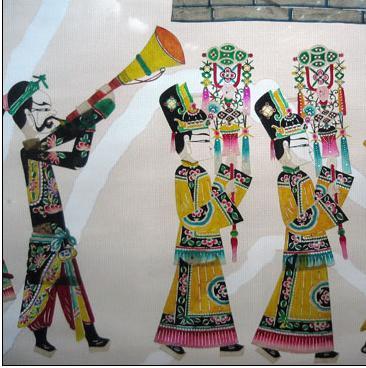 另外,皮影戲行頭簡(jiǎn)單,演唱條件寬松,它是從黃土窯洞里走出來(lái)的,屬于農(nóng)民的家庭戲、炕頭戲,下鄉(xiāng)演出的行當(dāng)只用一人挑、一驢馱足矣。一個(gè)皮影班通常由五六人組成,一名前臺(tái),一名鼓手,一到兩名弦手,一名吹手,一名后臺(tái)。前臺(tái)又叫挑線手或撐簽手,他不但要操縱皮影表演,還要唱白表演,劇中所有角色的唱白都由前臺(tái)一人包攬。在演出條件上,半截窯洞,一盞油燈,天黑即演,雞鳴而止,觀眾多少均不影響正常演出。對(duì)群眾來(lái)說(shuō),邀戲班來(lái)助興既方便隆重,且花錢不多,比較合算。因此,每逢廟會(huì)或者普通農(nóng)家在節(jié)日、農(nóng)閑等民俗活動(dòng)中都喜歡“寫”道情皮影戲班助興,并邀四方來(lái)客觀賞。這對(duì)道情皮影的發(fā)展與流傳在一定程度上起到了積極的作用。