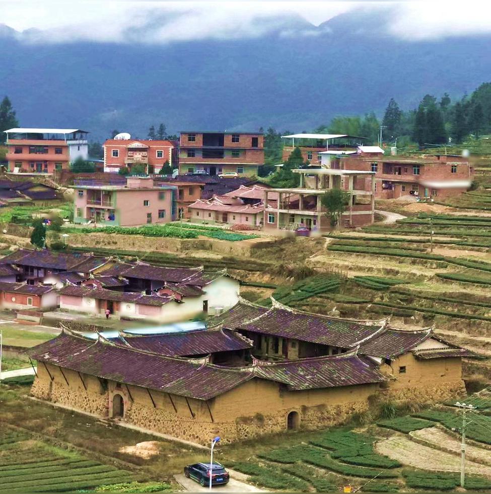 駕車沿著鄉(xiāng)村縣道公路來到爐地村,遠遠就能望見一座高大峻偉的方形土樓依山而建,背坐“鵝角髻、面向“石刀旗”,左依“鏡面山”,山環(huán)水繞,與村道田園融為一體。