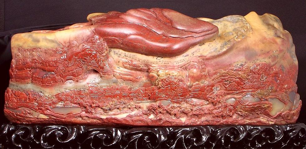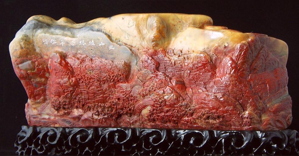 《三山繾綣幾千秋》是初山微畫雕古都系列藝術(shù)作品之一,該件微畫雕是用一塊大小為17.0×38.0×7.5㎝的壽山石雕刻而成的。作品試圖將時間圖像化,把福州幾千年的發(fā)展史濃縮在方寸之間,與福州人文景物的三維空間一起構(gòu)成“四維時空”,是一部用微畫雕方式表達(dá)的福州歷史。作者使用朦朧的寫意雕法給人們產(chǎn)生無限暇想空間。作品構(gòu)圖疏密有致,章法巧妙,布局合理,是一件極為難得微畫雕藝術(shù)品,現(xiàn)收藏在初山微畫雕刻藝術(shù)創(chuàng)作室。