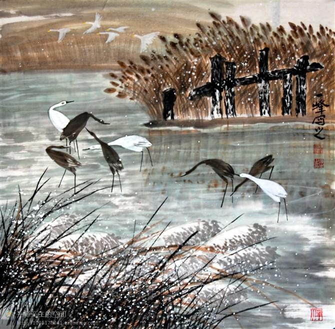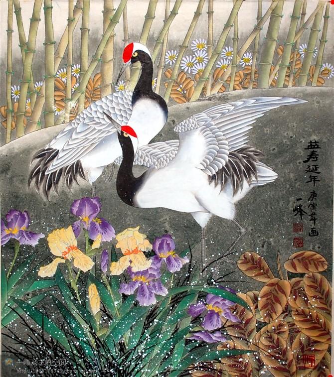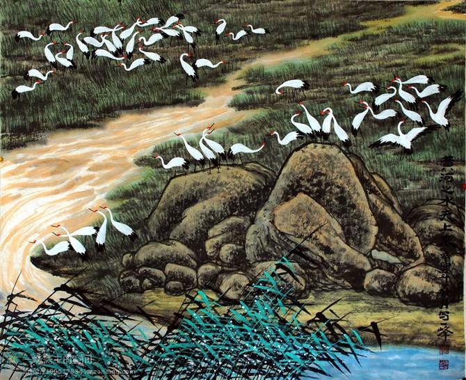 他的作品踐行了古人“天人合一”的主張。劉先生的佳作《紫氣東來》、《鶴壽祥瑞圖》、《鶴壽延年》、《陽春三月》、《雨后清新》等,深得古人“天人合一”之意境,讓人體會到他創(chuàng)作時的心景,猶如月夜清靜明凈,又似春風(fēng)吹蘇萬物,完全把自己融入大自然的懷抱,畫中陽光、空氣、大地、河水、禽鳥、草蟲、植物、花卉渾然一體,組成鮮活的生命交響曲,深受觀眾喜愛。
