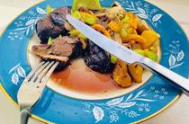 紅酒西芹烤鹿肉 因為鹿肉脂肪很低,沒敢按平時做牛排的路子,而是一步步按包裝上instruction做的。結(jié)果!太干了!太干了!它居然讓我先烤再煎
