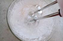 待糖水達(dá)到116度時關(guān)火,慢慢的倒入蛋清中,邊倒邊用打蛋器攪打。混合均勻后再打2分鐘左右,提起打蛋頭成尖角狀。