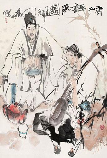 他也采用夸張、變形的表現(xiàn)手段。但一切都是為了準(zhǔn)確地表現(xiàn)人物的內(nèi)心世界,而不是流于形式或追求怪誕。他總是從對(duì)象的特殊性格出發(fā),來(lái)尋找相應(yīng)的筆墨語(yǔ)言。他的畫風(fēng)灑脫、約略,耐人尋味,其細(xì)膩處有工筆畫的精微,其粗獷處有寫意畫的豪邁。他特別注重情感的抒發(fā)、意境的渲染,其筆下的人物,無(wú)論是古代還是現(xiàn)代人物,都蘊(yùn)藏著生命情愫。得到美術(shù)界同仁的一致好評(píng)。