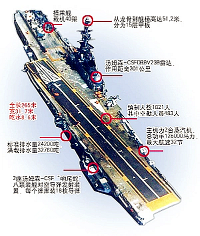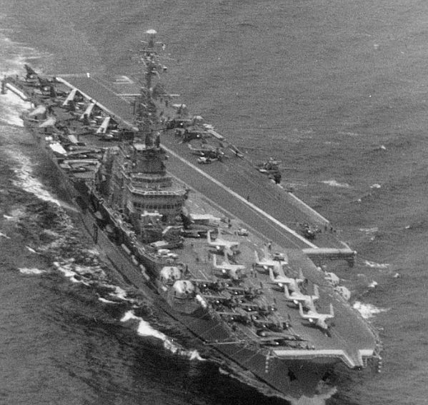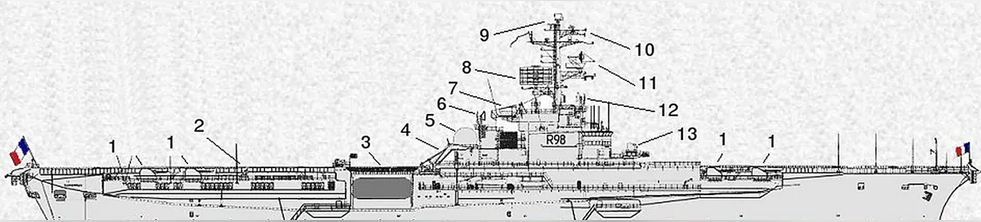 艦載機(jī):16架超級(jí)軍旗式攻擊機(jī)、10架F-8E(FN)十字軍式戰(zhàn)斗機(jī)、3架軍旗式IVP攻擊機(jī)、7架信風(fēng)式反潛機(jī)、2架以上云雀式或皇太子式直升機(jī)