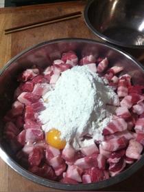 豬肉切成兩厘米左右的方塊,不用過(guò)水,放盆里磕兩只雞蛋,半碗面粉,面粉可以看情況逐步增加