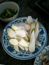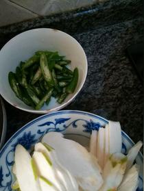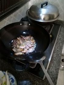 鍋里倒油,油燒成5成熟,倒入臘肉爆一下,大概炒3分鐘鏟起來(lái)。油不用鏟完留點(diǎn)在鍋里。