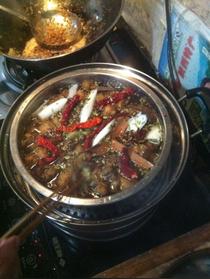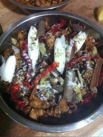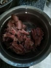 然后放盆里,放上各種大料,因?yàn)橹肮娴臅r(shí)候加鹽了,現(xiàn)在鹽要控量,桂皮,八角,生姜,干辣椒,什么什么的,我也不一一說(shuō)了,上面都有
