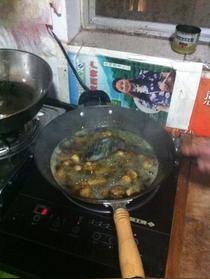 拌好后就下油鍋炸肉,炸到表面變成焦色即可,撈出控油