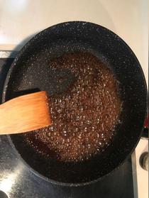等五花肉煮到40分鐘后,把鍋燒熱加入少許水,倒入白糖不停攪拌,直到熬制出糖漿