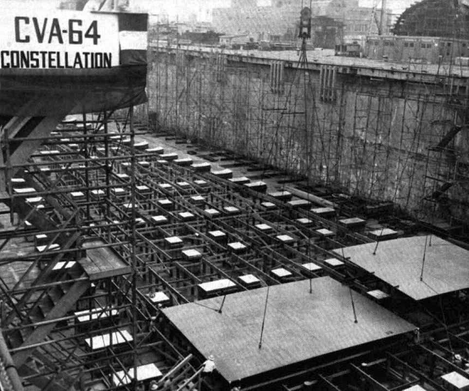 1956年12月27日,小鷹級(jí)首艦CV-63“小鷹”號(hào)(原舷號(hào)CVA-63)在紐波特紐斯造船及船塢公司開工建造,1957年9月14日,2號(hào)艦星座號(hào)也在該公司建造,但在1960年底,“小鷹”號(hào)船體接近完工的時(shí)候,發(fā)生了一場(chǎng)火災(zāi),船體損壞嚴(yán)重。為使首艦“小鷹”號(hào)能按期下水服役,美國海軍便調(diào)換了“小鷹”號(hào)與星座號(hào)的船體。之后原“小鷹”號(hào)發(fā)生火災(zāi)的船體成了新的星座號(hào),并被拖至紐約布魯克林造船廠繼續(xù)建造,于1960年10月8日下水,1961年10月1日完工。服役歷程