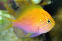 體側(cè)扁,略呈卵圓形,特征是頭部具黃色放射狀細(xì)紋。雌魚體為粉紅色,雄魚為鮮紅色,近背部鱗片皆具黃色緣,尾鰭叉形。