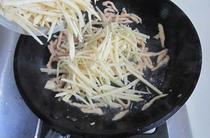 熱鍋涼油, 放入腌制好的雞絲進(jìn)去翻炒;