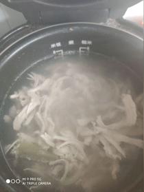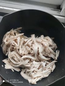 將撕好的雞絲倒入鍋內(nèi)繼續(xù)燜煮