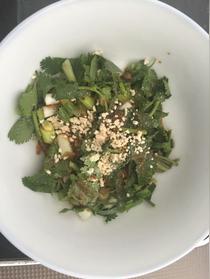 燒水期間,把蔥花跟香菜用鹽,生抽,雞精,香油一點(diǎn)點(diǎn)腌起來。