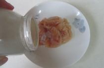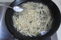 燒鍋開水, 將冬筍絲放入里面焯水, 注意焯水時(shí)加入少許的鹽和糖;