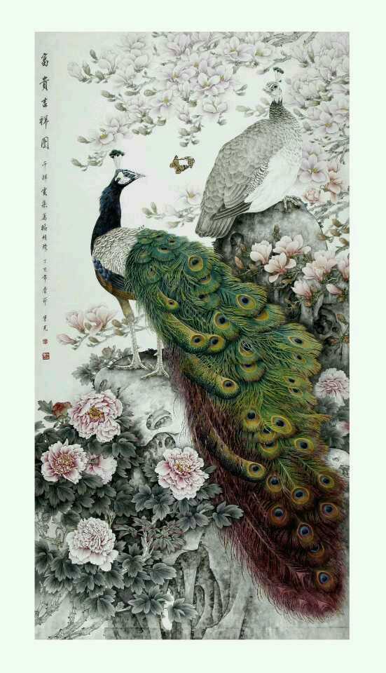 《富貴吉祥》圖孔雀系列,是蘇宇光先生的代表作,他以精微的筆觸,結(jié)合西畫設(shè)色的技法,不惜繁復(fù)將孔雀的翎羽刻畫得金碧輝煌錦繡鋪成。在中國藝術(shù)博覽會上,有觀者以為畫中孔雀的羽毛是真羽毛貼上去的,伸手去揪,才發(fā)現(xiàn)是畫上去的,畫技之高超令人驚嘆不已。