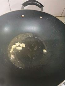 油鍋燒至六成熟倒入玉米油,大火煸炒香大蒜出香味
