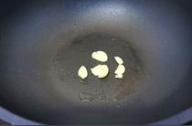 油溫五成熱時放入蒜片爆出香味。