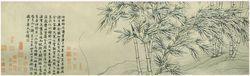 張遜《畫(huà)雙鉤竹》卷孤本存世。此圖紙本,水墨,縱 43.4 厘米,橫 686厘米。畫(huà) 坡陀間雙鉤竹數(shù)叢,枝干勁挺,竹葉扶疏,間作老松披佛偃仰。石用中鋒圓筆鉤皴,有董源、巨然遺意。本幅后楷書(shū)自題記上款“伯時(shí)”,下署“至正九年四月卅日,吳郡張遜題于吳氏舍館”。鈐“張遜私印”。作于1349年,是張遜晚年用心之作。