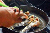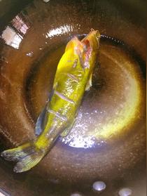 4、不粘鍋內(nèi)放油燒熱,下昂刺魚,一面煎黃翻過來煎另一面;
