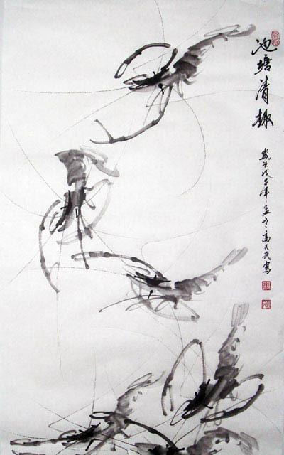 高天武畫蝦,汲取弘一法師、齊白石、孫星閣及當代畫家鄧清泉等諸多名家之長,逐漸形成自己的特點。蝦主要由頭、腹、尾組成,從蝦腹第三節(jié)開始彎曲,畫時不注意,就畫成了死蝦。水墨畫蝦,最具藝術(shù)效果。筆間水分要恰到好處,水分小,蝦非但沒有透明感,反而畫死了;水分大,蝦的體形臃腫無力,變形失真。他總結(jié)出“蝦槍一筆定方向,腹尾屈伸意不同”的畫蝦訣竅,畫時一氣呵成。蝦的臂、腕、鉗的動作,猶如拉弓射箭,有活力,有看點。蝦腦、復眼、鉗腳和觸須,從深到淡,清逸、靈凈。他畫蝦,很少補水草,而是以蝦映出水,達到“此處無水勝有水”的妙境。