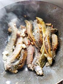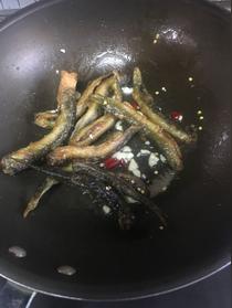 4、鍋中留約半湯匙油,下另一半蔥段、姜片炒出香味,加約半杯湯或水,下炸好的泥鰍、一大匙料酒、白糖、醬油用中火燒(不加蓋)。