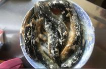 2、將泥鰍剖肚去腸后洗凈(泥鰍也可以不剖肚,做法是將它們放清水中養(yǎng)幾天,水中放適量油),放鹽搓揉去表面粘液,再次沖洗凈。取姜片、蔥段各一半、兩匙料酒、一咖啡匙鹽抓勻碼味半小時(shí)左右。